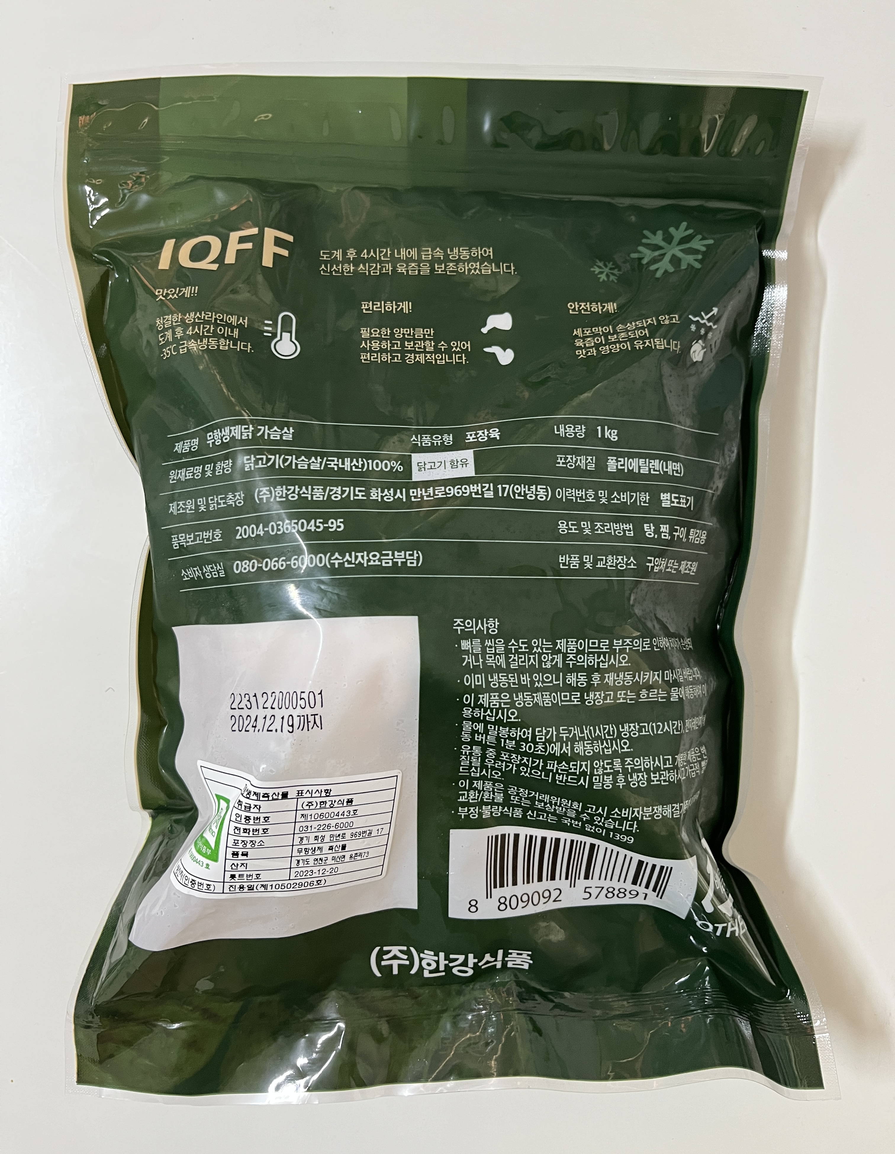 도계 후 4시간 내에 급속 냉동한 IQFF 제품으로 무항생제 인증 된 100% 닭가슴살이라 건강하게 먹을 수 있을 것 같았습니다.